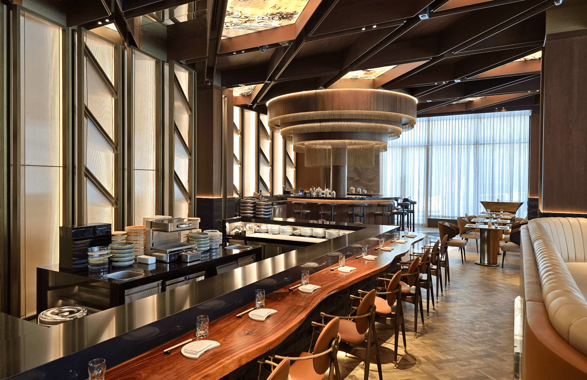 Ambiance: Strategic dimmable lighting (2700K) and acoustic ceiling baffles to allow quiet conversation.